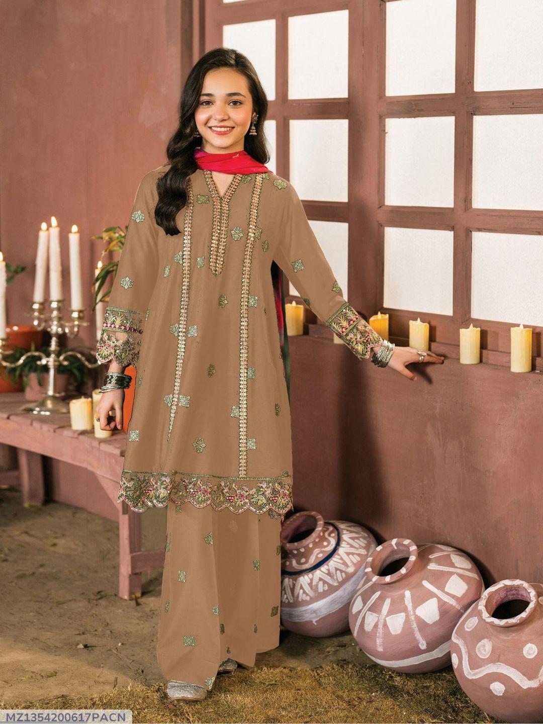 Elegant 2-piece kids suit with multi & zarri embroidery on front neck, sleeves, and border. Made with soft premium cotton, perfect for comfort and style.
