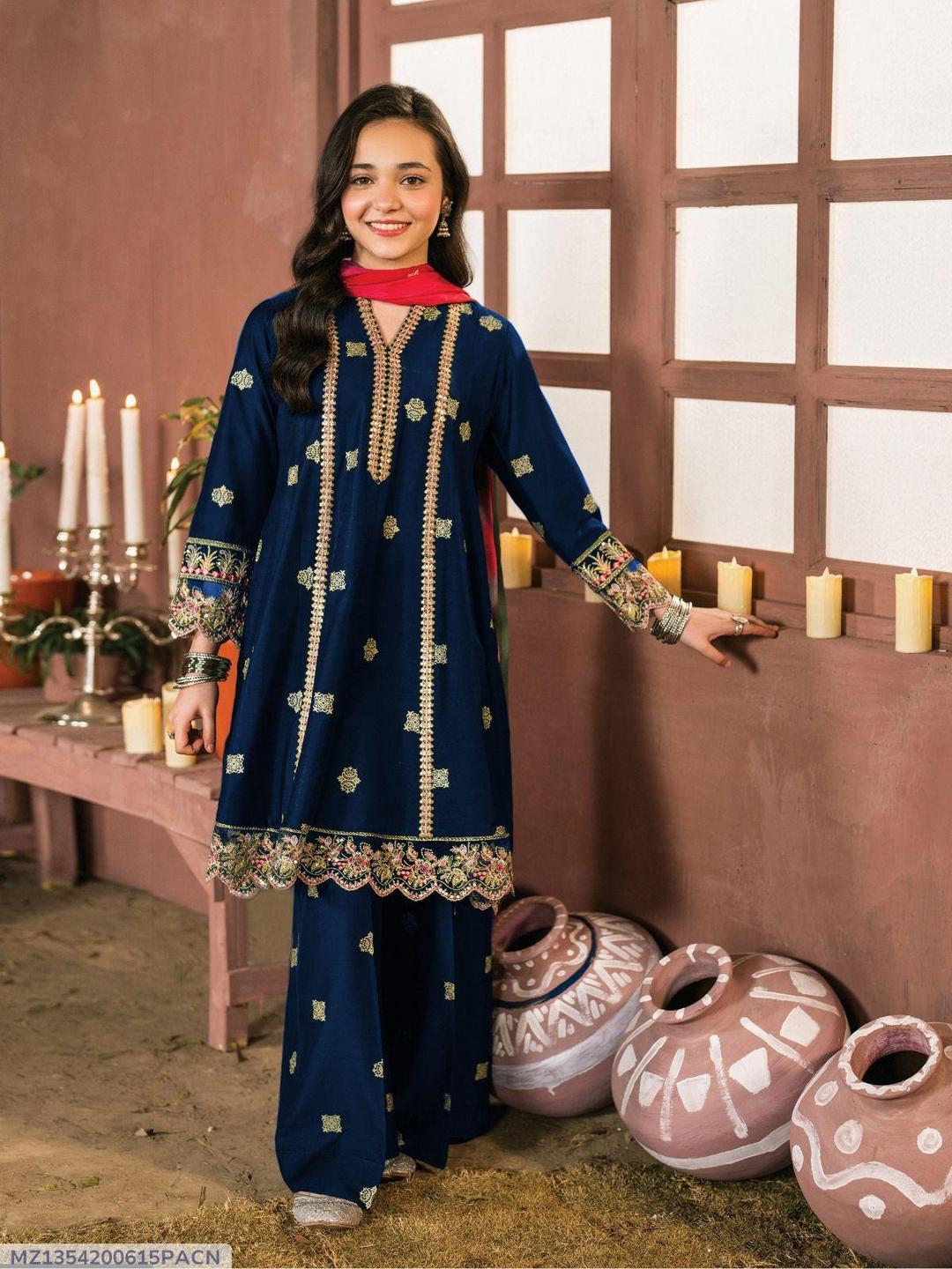 Stylish kids’ 2-piece suit featuring multi and zarri embroidery on front neck, sleeves, and border with an embroidered flapper. Crafted from soft premium cotton for comfort and elegance.