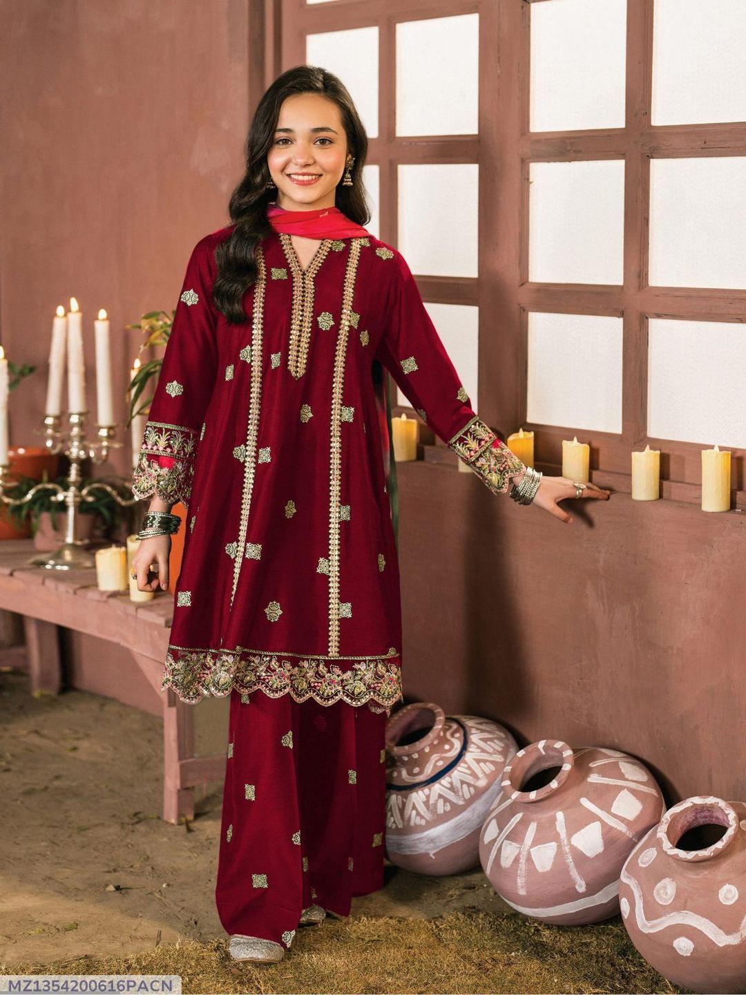 Elegant kids’ 2-piece suit with multi and zarri embroidery on the front neck, sleeves, and border, paired with an embroidered flapper. Made from soft premium cotton for comfort and style.