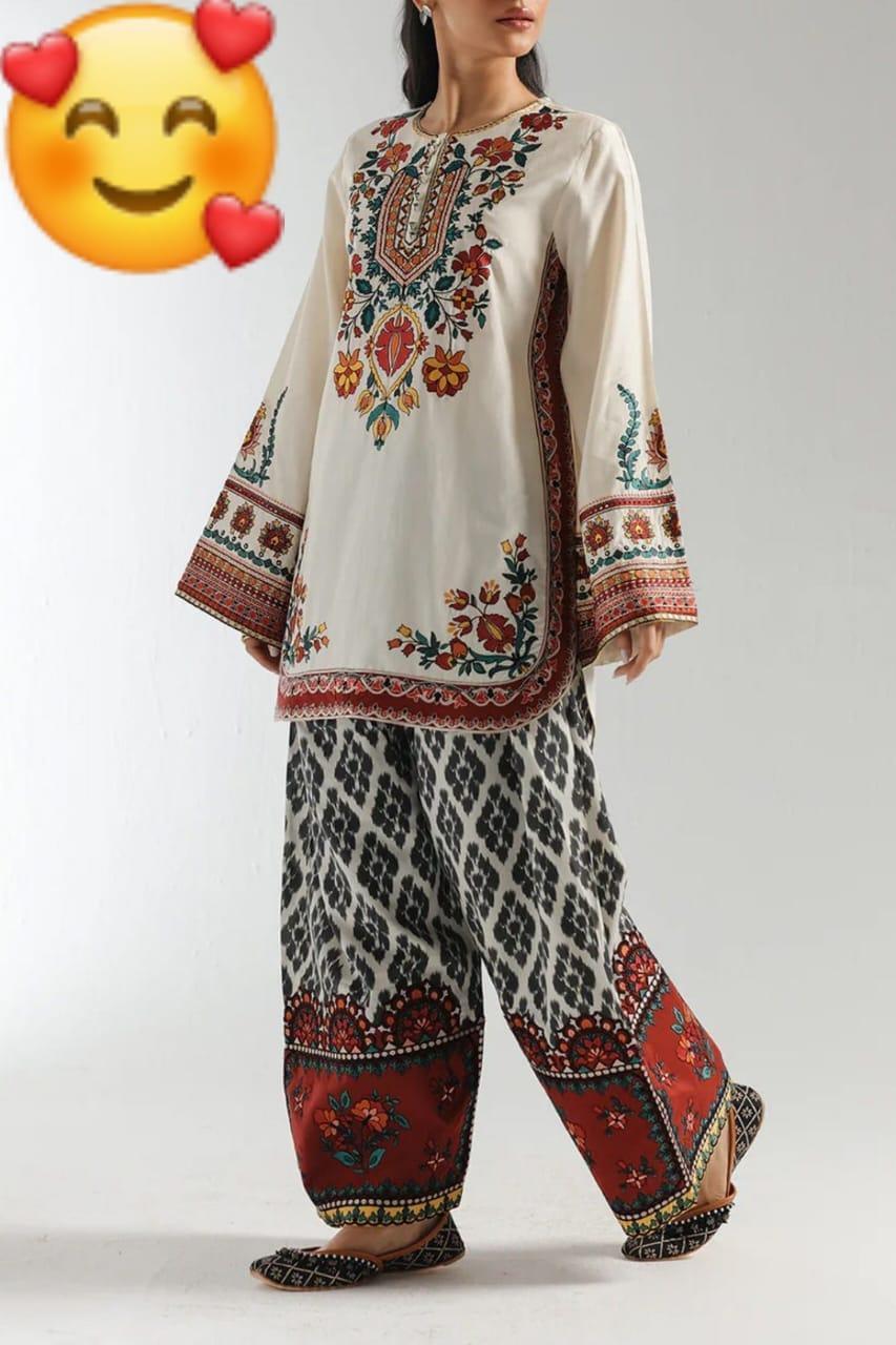 Beautifully designed digital print shirt paired with matching bell-bottom trousers. Crafted from premium Swiss silk for a luxurious and elegant look.