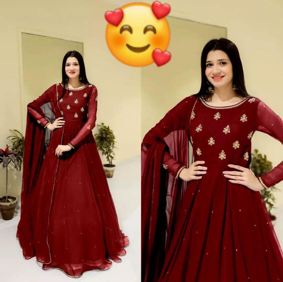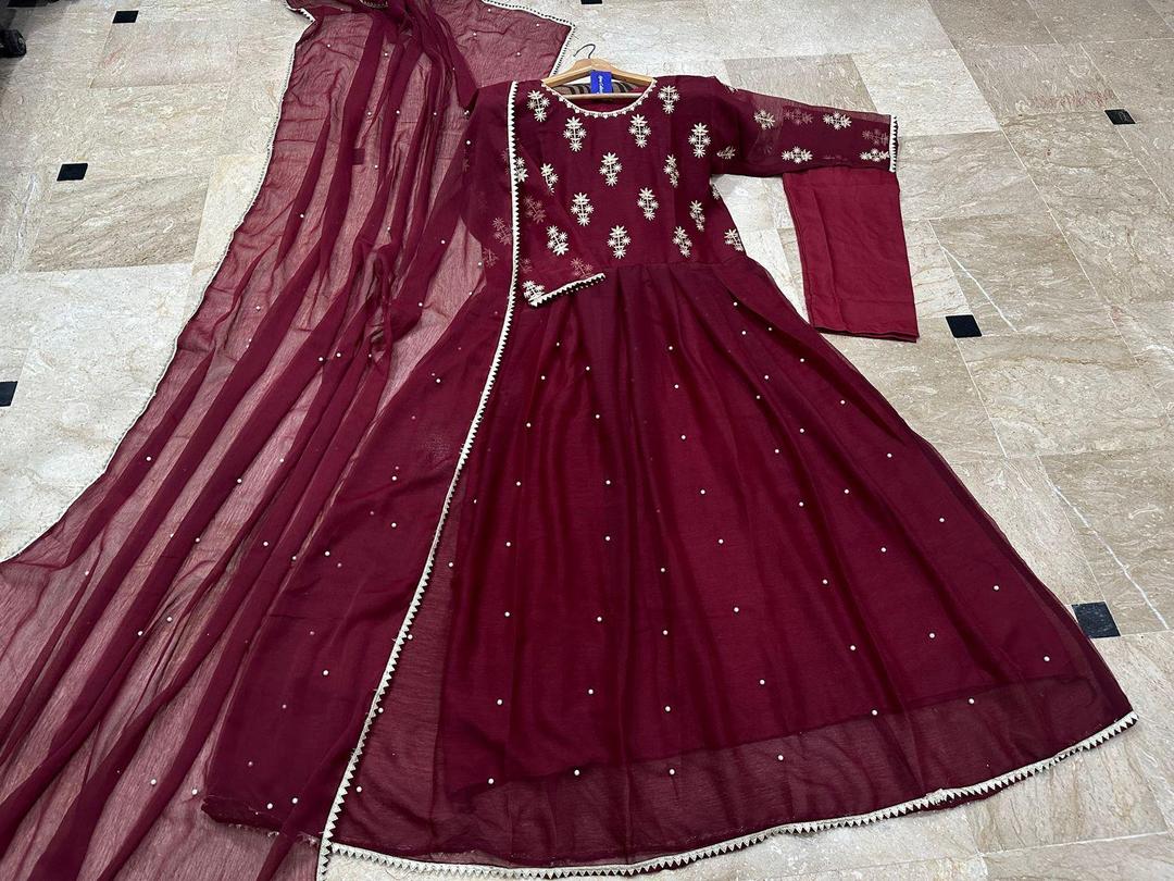 Chiffon Maxi with Pearl Dupatta – Maroon (3Pc)