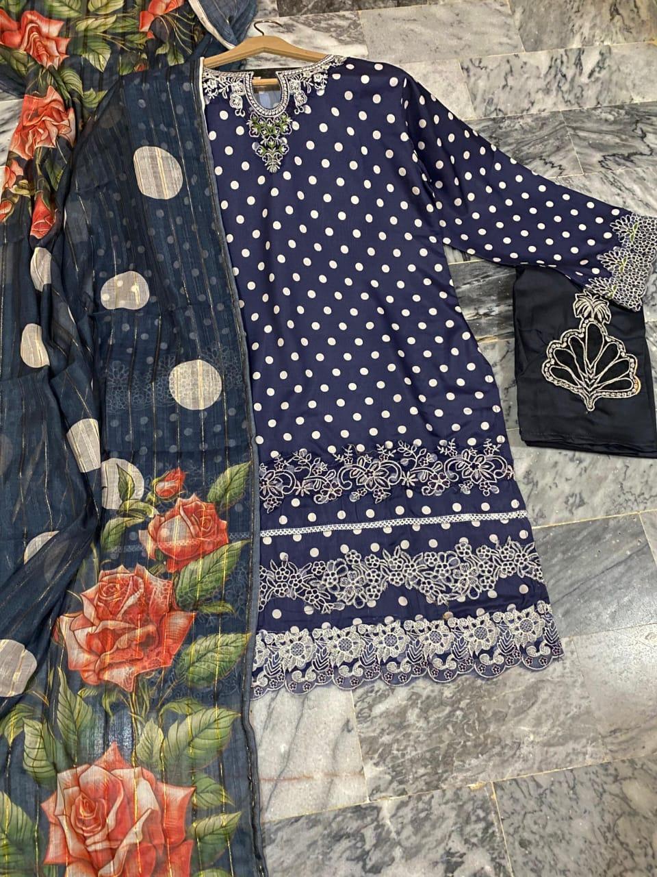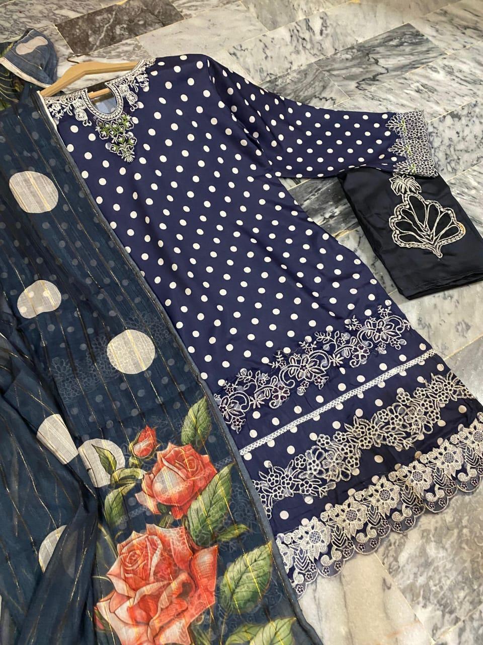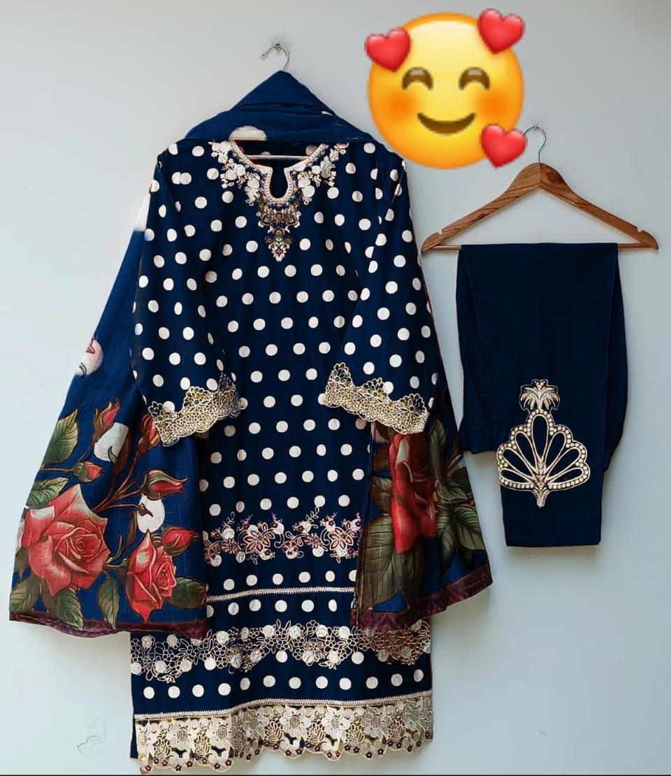 Polka-printed Swiss lawn shirt with embroidered patch on the neck and border, paired with embroidered trouser and printed monar lawn dupatta. Elegant and breathable for everyday wear.