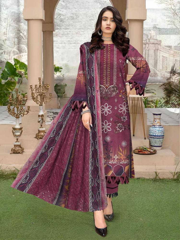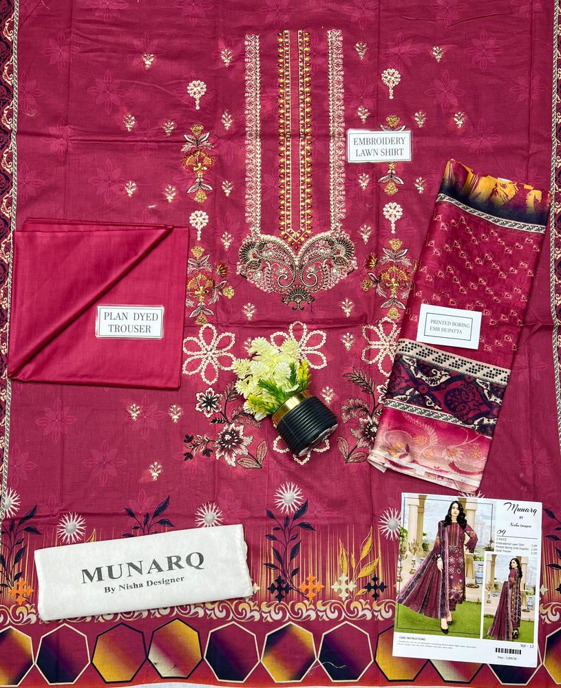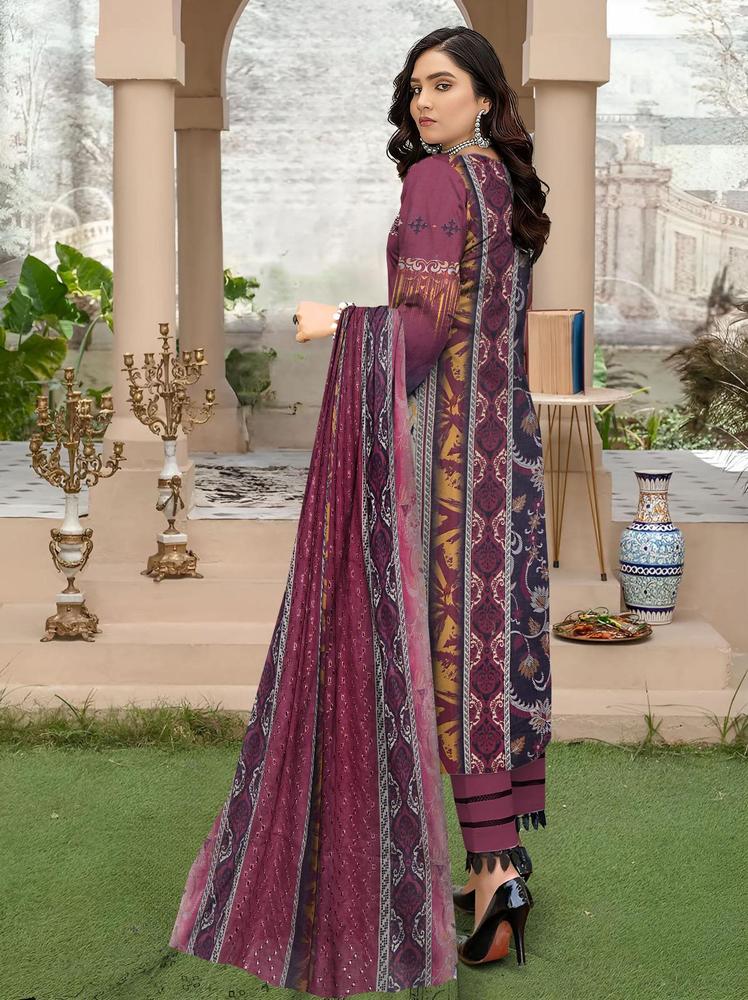Magenta embroidered lawn shirt with plain trouser and printed embroidered dupatta.