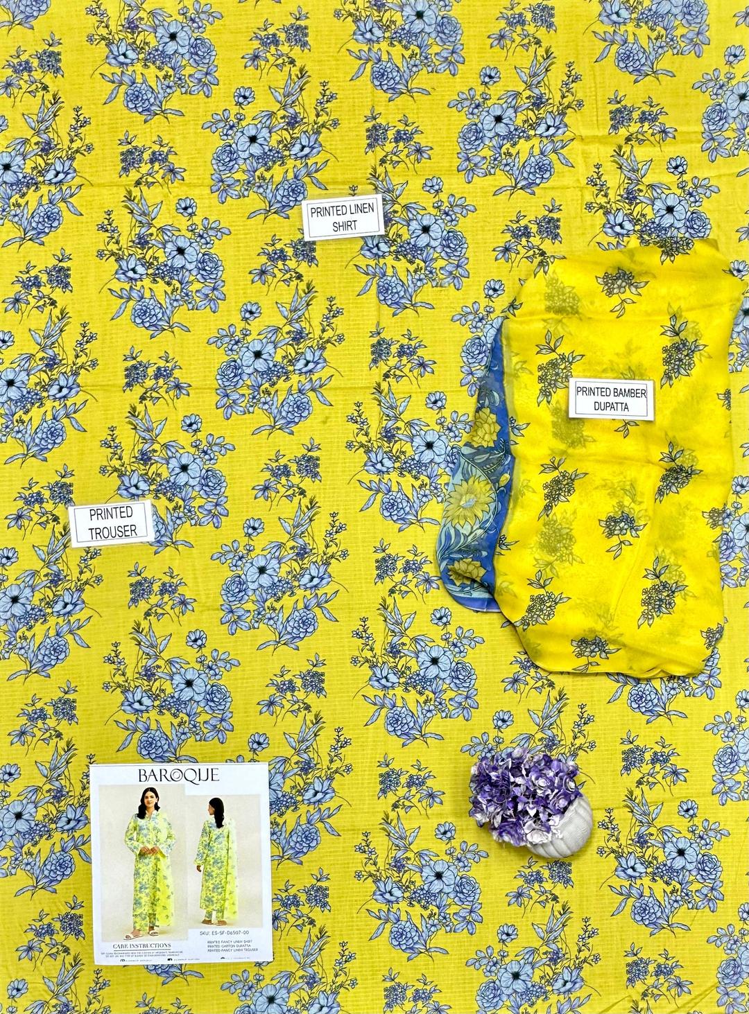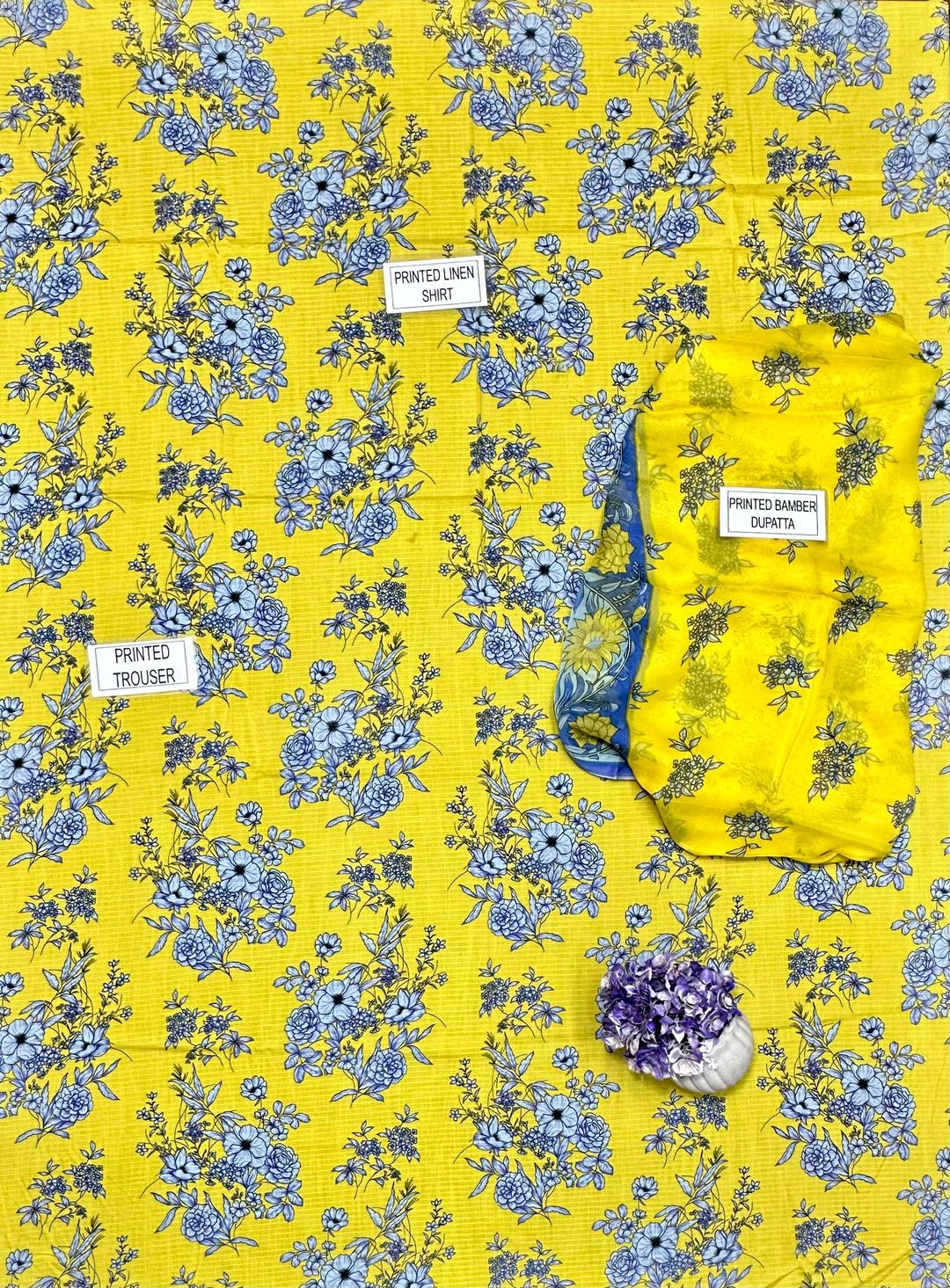 Bright and beautiful — a vibrant 3-piece yellow linen suit with a bamber dupatta for a cheerful, fresh look.