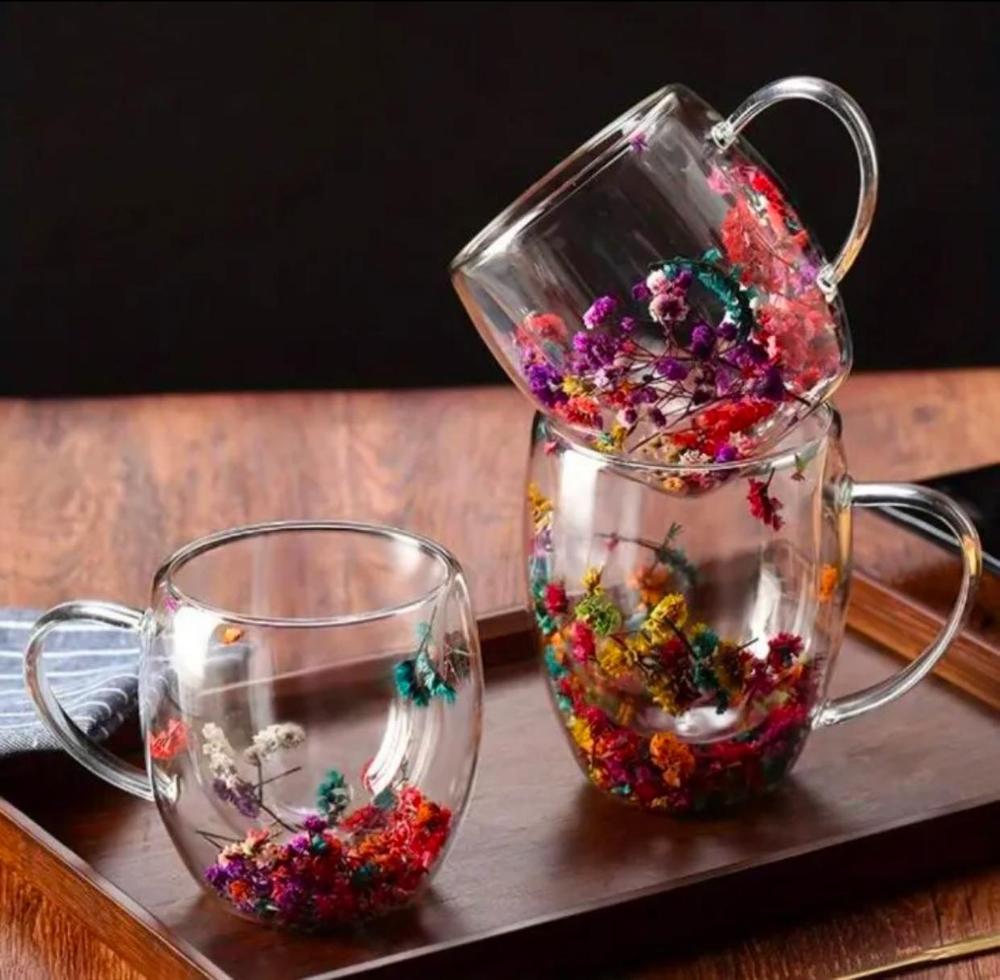 Double Glass Artificial Flowers Transparent Coffee Mug - 350ml
