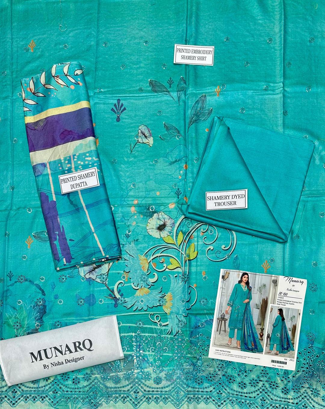 Step out in style with this beautiful blue embroidered suit set, featuring intricate patterns across the shirt, sleeves, trouser, and dupatta. Made from high-quality Shamery fabric, this 3-piece ensemble blends tradition with modern design effortlessly.
